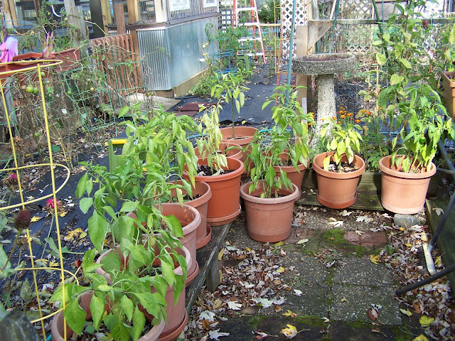 The vegetables have all been harvested, frozen, dried, or canned. We had hoped for an extended season, but multiple frosts really ended it. These are all the potted Peppers, which are no longer blooming, so into the compost pile!