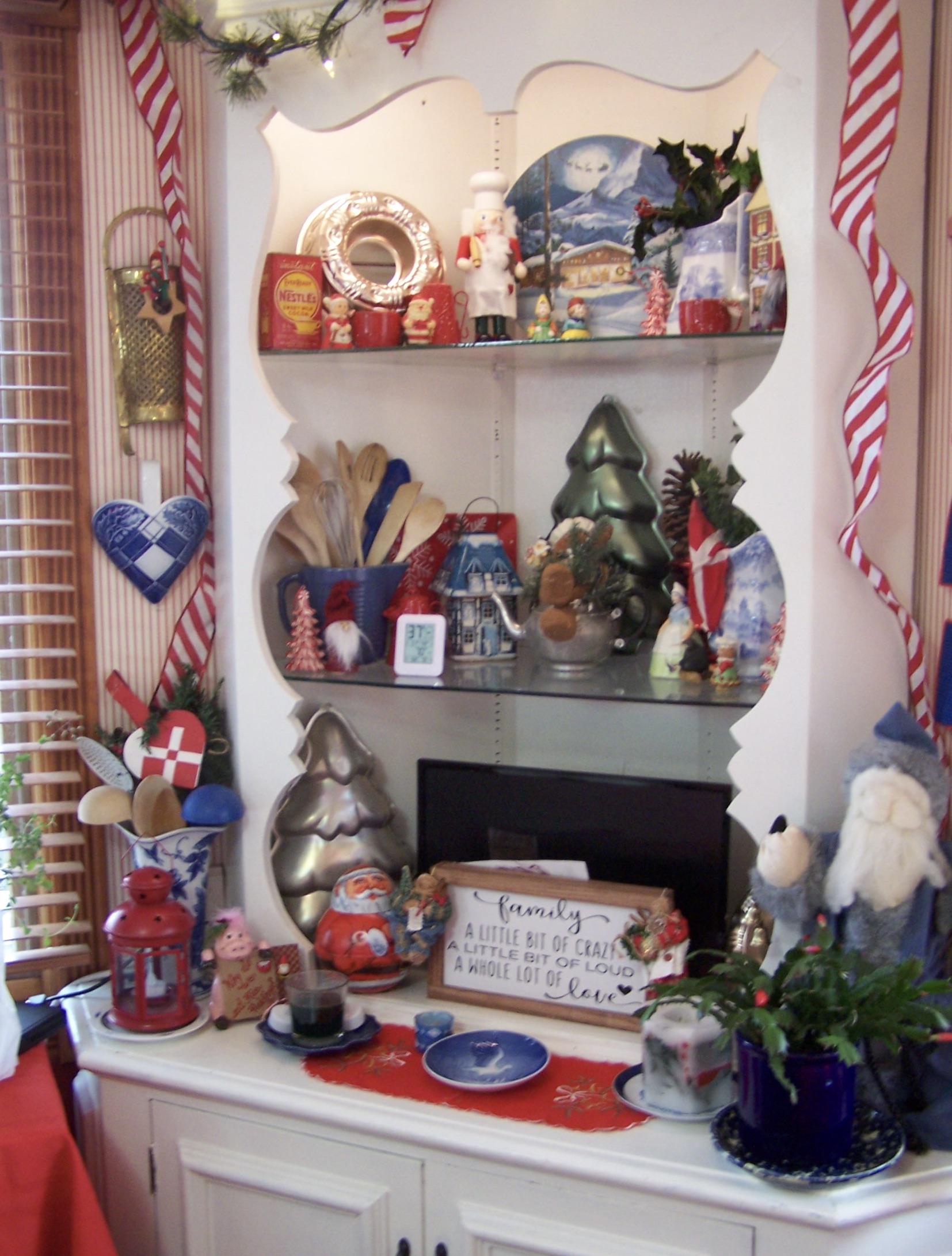 The corner cabinet is a hodge lodge of Danish items, gnomes, vintage tins, cookware, baking items and and just lots of fun things.