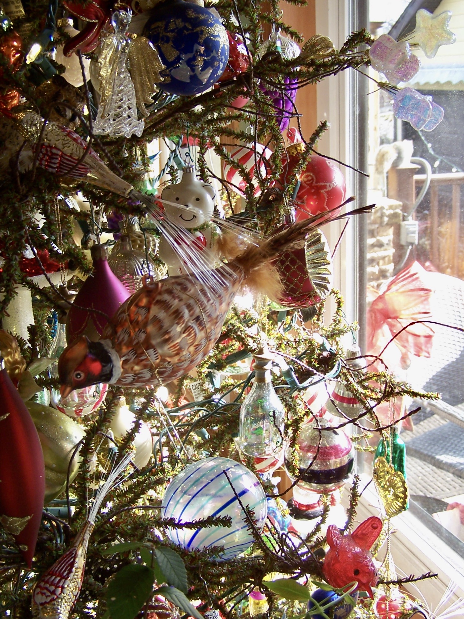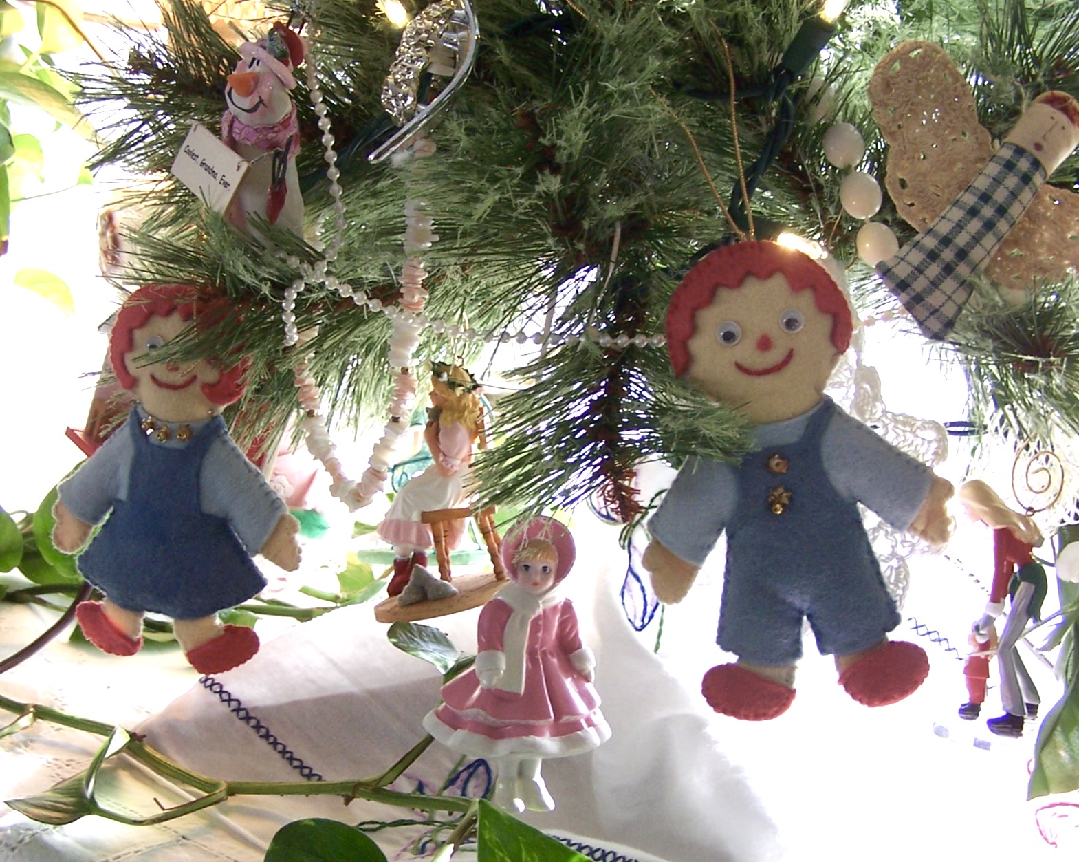 This skinny-minny tree...and is full of Barbie, American Girl, hand made toys, and collector ornaments with a 'girl' theme. Hubby's woodland tree is in the basement family room.