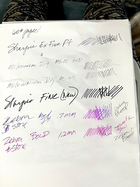 Sharpie Ex Fine Pt: Probably my go to scribble pen, reasonable in multi packs. Last for awhile if you are gentle. Tips will mash and sometimes the cap isn't closed completely and dries out. Alcohol based ink which is permanent. You can fix a drying up pen by dipping in alcohol.