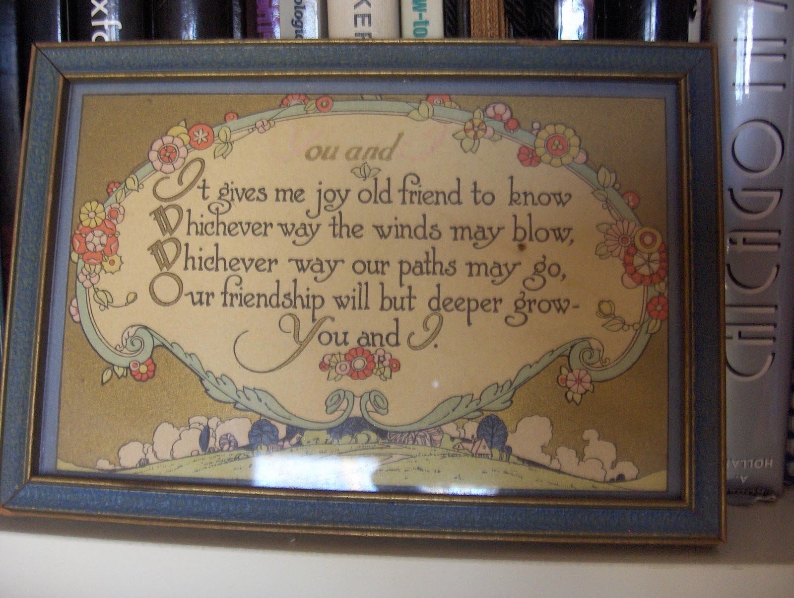 This sweet little quote picture was from a friend. It's from the 1920-30's. Two words have faded at the top, You and I. I LOVE the sentiment and the stylized artwork. The background is metallic gold---seasoned and in the original frame. (Sadly the gifter has passed, and I miss our shares deeply).